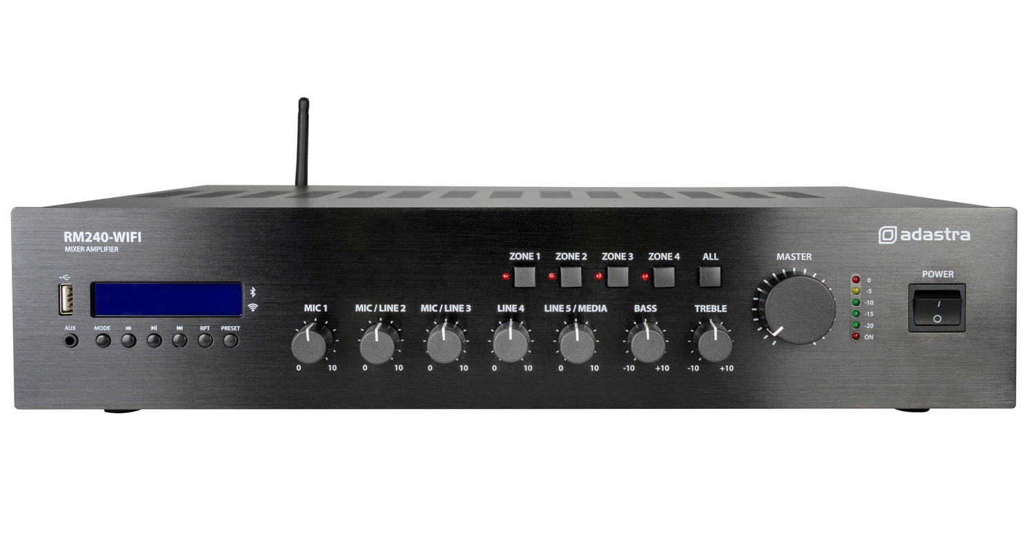 5-channel 19" rack-mountable mixer-amplifier, designed for commercial sound installations to power 100V line speakers or standard low impedance speakers. Input options include XLR (with switchable phantom power), mic/line jack, and RCA line. A switchable ‘voiceover’ feature automatically lowers the background music volume when a signal is detected via mic input 1, and rear panel 24V contacts can mute all except mic input 1 when triggered. A built-in audio player section can play mp3 files from a USB or stream audio wirelessly from Bluetooth®. A main feature of the RM-WIFI models is the ability to connect to a wired or wireless network for streaming audio from internet radio, playback services or even from a local NAS drive. Setup and control for this function is entirely via the WiiM Home smart phone app with a choice of streaming services embedded. Outputs on screw terminal are via 4 switchable zones with a separate "always on" output for priority alert speakers.