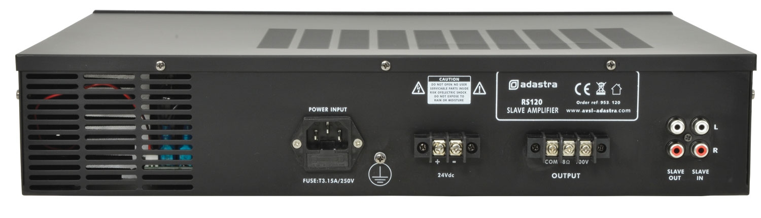 High power 100V line slave amplifiers in a 2U rack-mountable housing. Slave inputs can be connected from Adastra RM series mixer amplifiers and slave outputs onto further RS slaves. Master volume control governs output level to either low impedance or 100V speakers. Designed to power medium to large installations from a mixer output or expand existing systems.