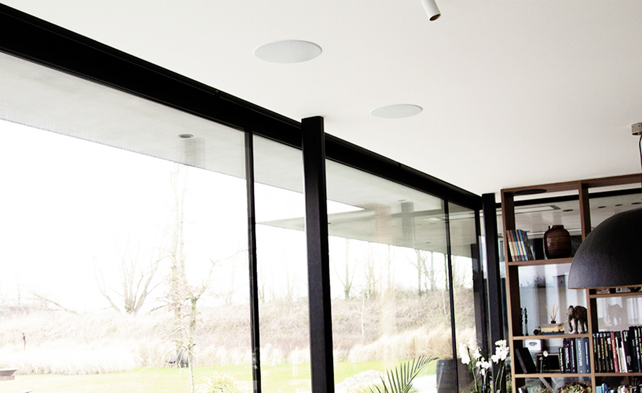 The frame of the Flat in-wall speakers is 1 millimeter wide and 4 millimeters thick. The design is strikingly slim for a particularly pleasant sound.