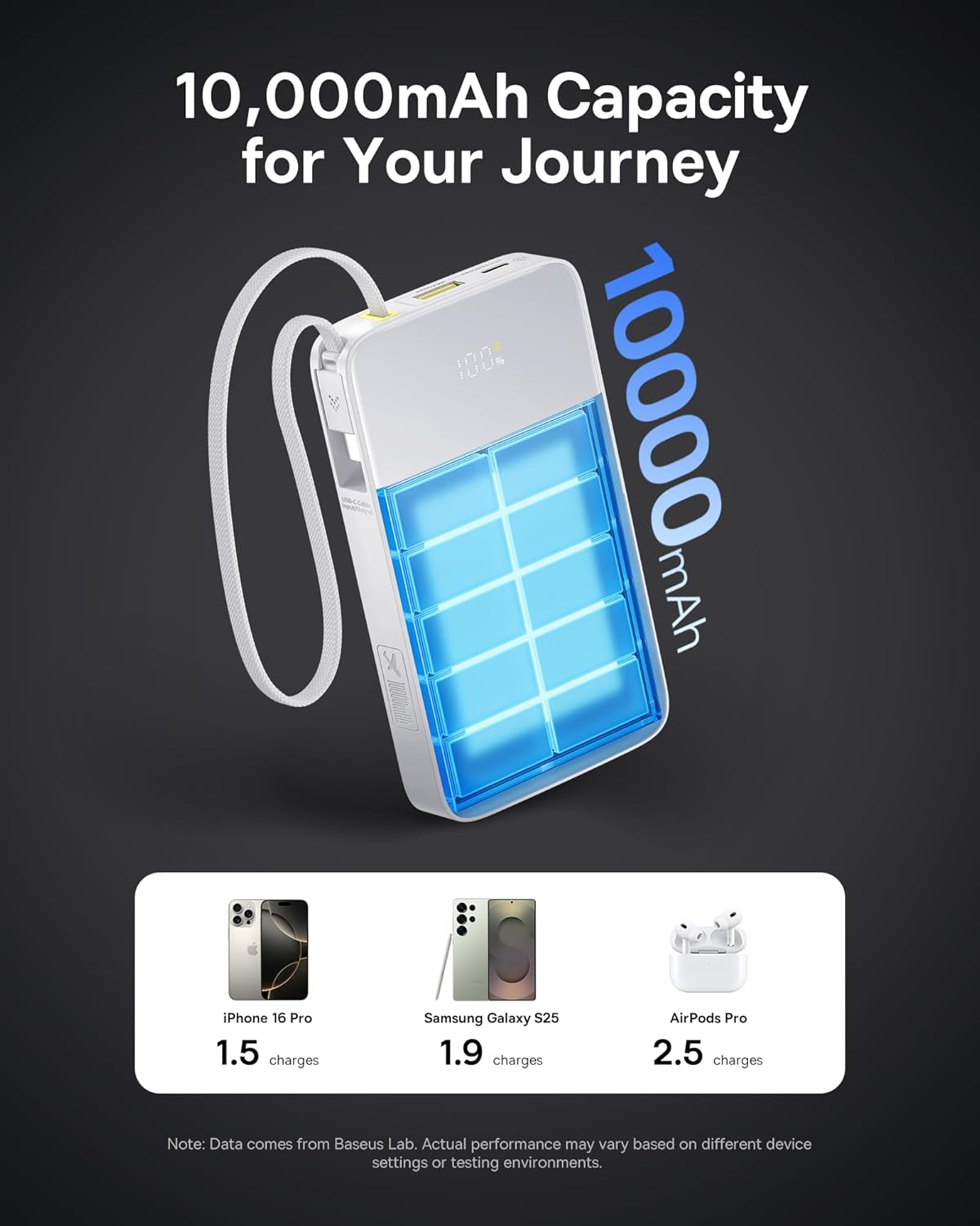 - Built-in Braided USB-C Cable – Say goodbye to tangled or forgotten cords. The built-in 10,000-bend-tested nylon USB-C cable keeps charging simple and clutter-free—ideal for shopping, travel, airports, libraries, and more. Travel light and stay powered wherever you go