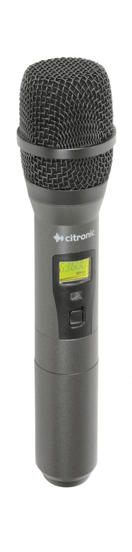 UHF handheld transmitter compatible with Citronic wireless systems. The carrier frequency can be programmed via I.R. sync signal from the Citronic wireless receiver unit.