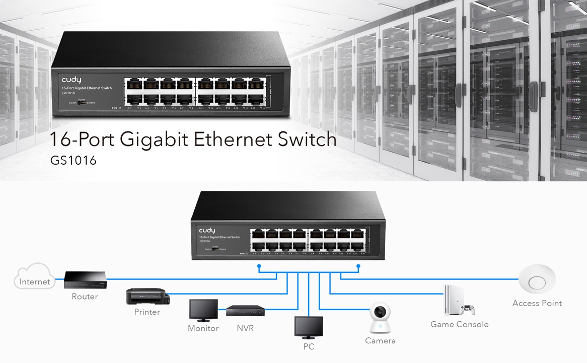 • 16 10/100/1000Mbps Auto Negotiation, Auto MDI/MDIX ports provide smart switching abilities