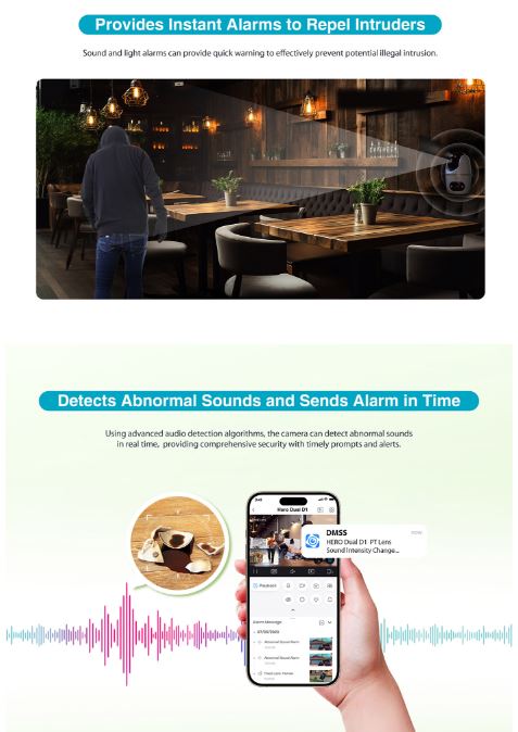 • The Hero Dual Series, part of the Dahua Wireless series, has both fixed and PT lenses, allowing for simultaneous live monitoring of two areas with just one camera for multi-angle coverage. Both lenses offer AI human & pet detection, which significantly reduce the occurrence of false alarms. Particularly, the PT lens can identify moving targets and track them automatically. When the camera detects an intruder, it will trigger sound and light alerts and send notifications to the mobile client, keeping you up to date regardless of your location. These cameras are commonly used in small-scale scenarios as stores and restaurants