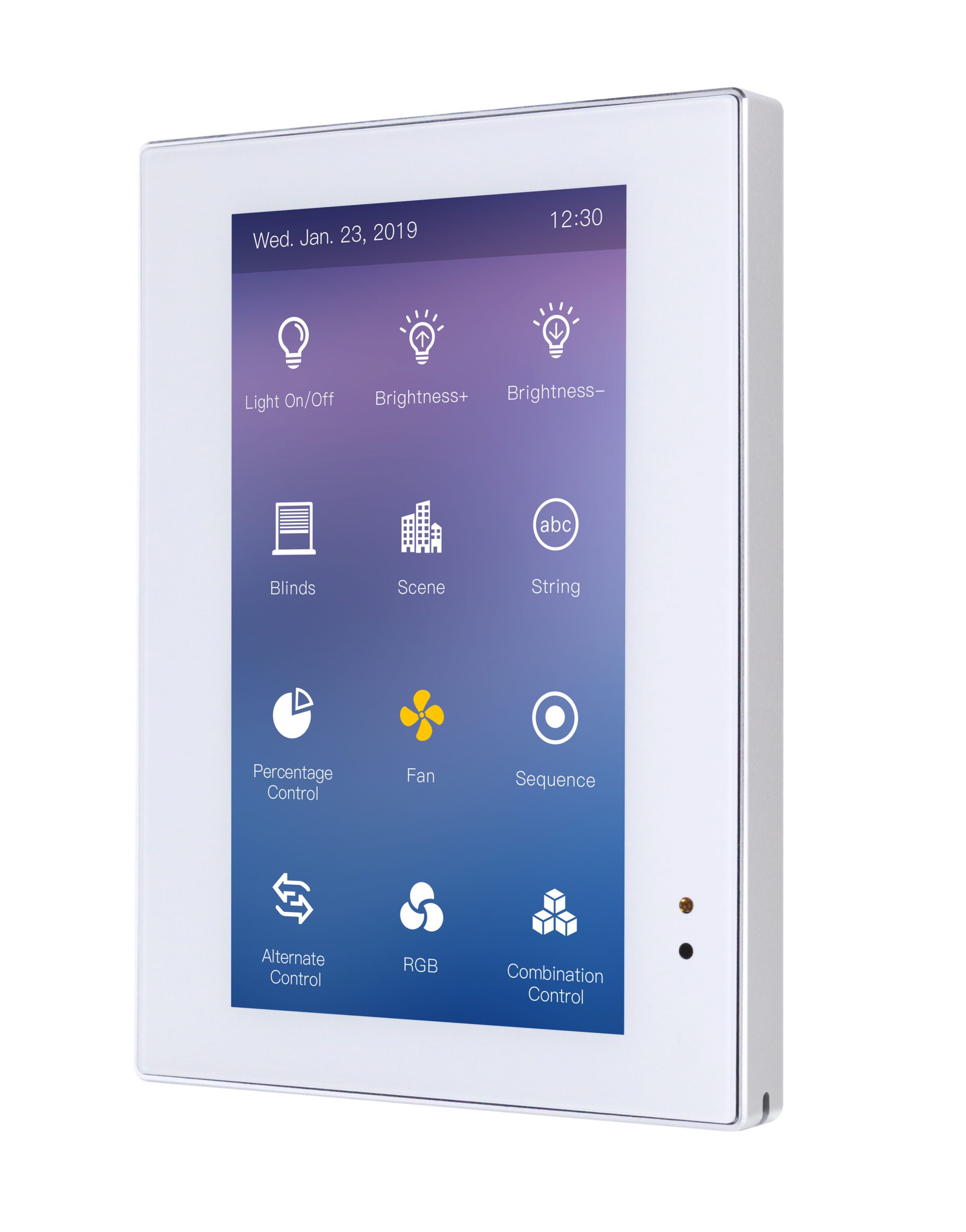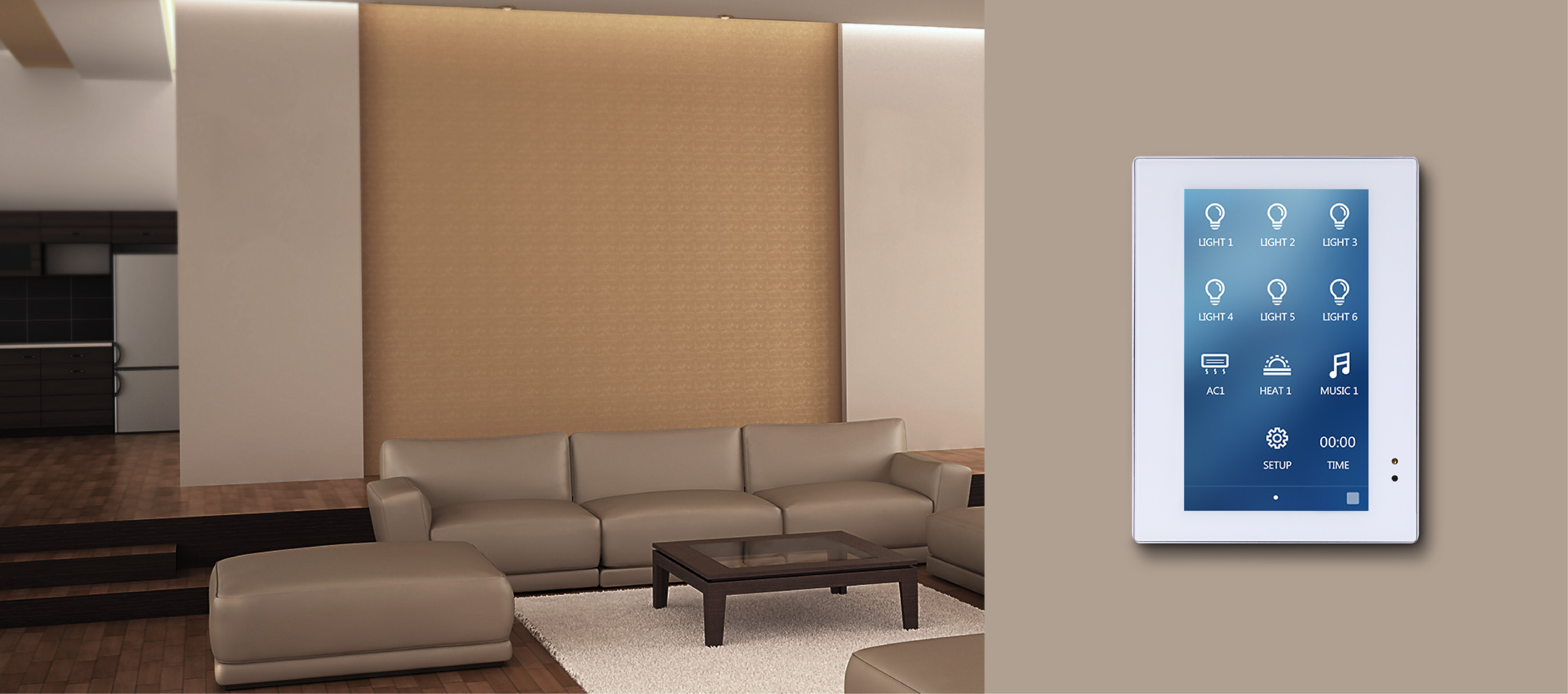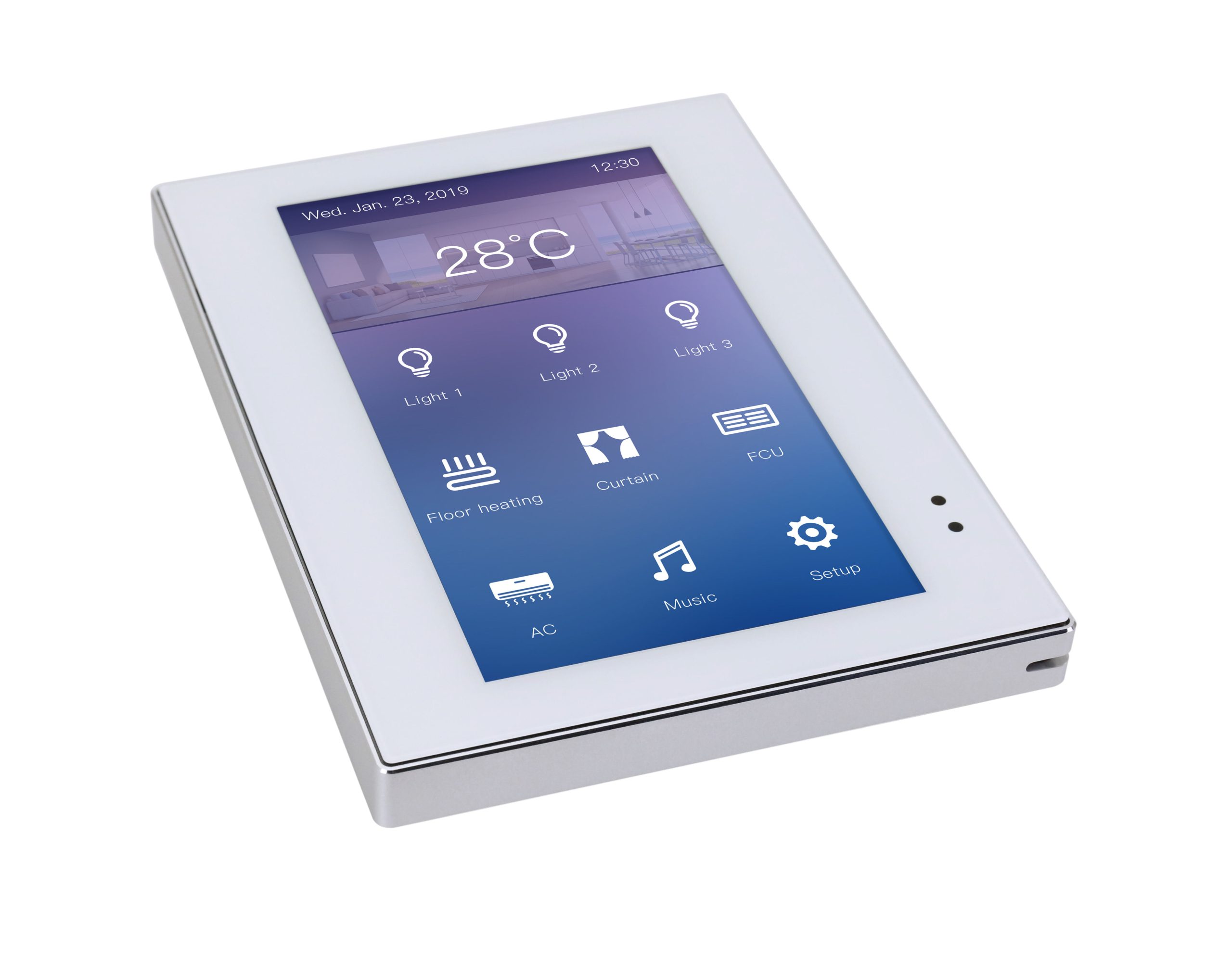 4.3 inch Enviro Touch Screen is a multi-function touch panel which supports the control of lighting, switches, air conditioners, FCU, music and floor heating etc. The 4.3 inch Enviro Touch Screen adopts 4.3-inch real color LCD screen and supports full touch screen control, which is easy and convenient to operate.