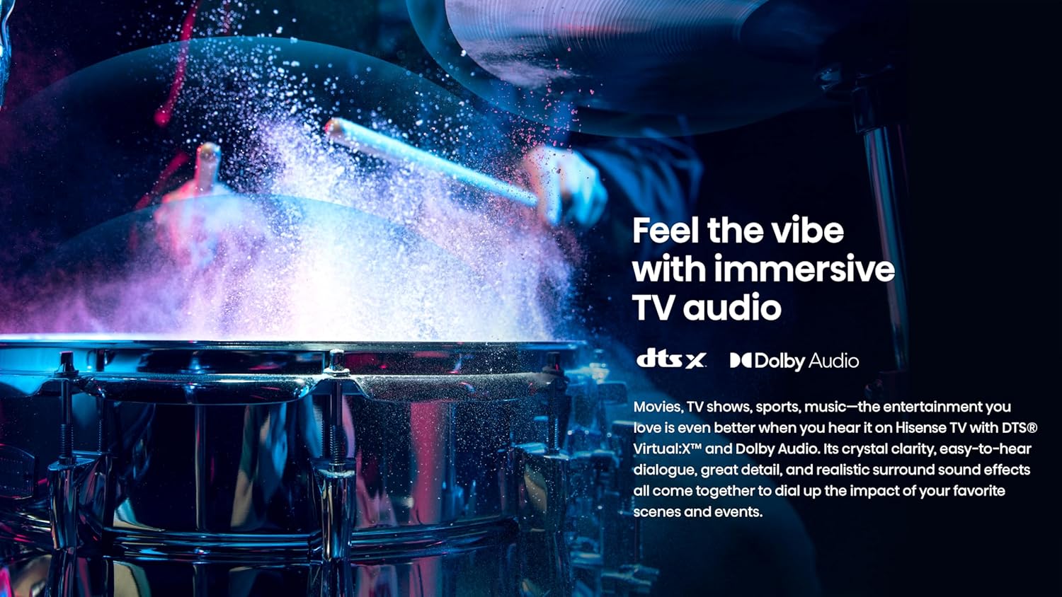 Movies, TV shows, sports, music—the entertainment you love is even better when you hear it on Hisense TV with Dolby Audio and DTS® Virtual:X™. Its crystal clarity, easy-to-hear dialogue, great detail, and realistic surround sound effects all come together to dial up the impact of your favorite scenes and events
