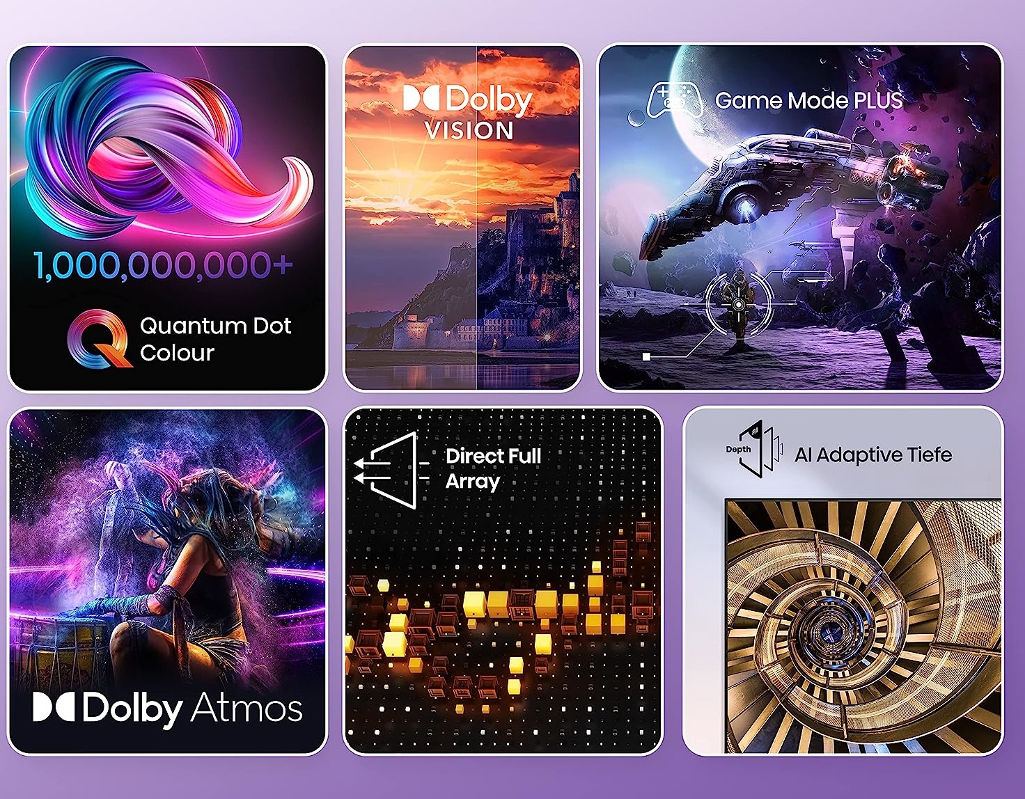- QLED –Â Get closer to reality with over a billion true-to-life colors. A wider palette of color ensures smoother gradients whilst reds, greens and blues appear for more vivid and realistic watching experience, especially for gaming.