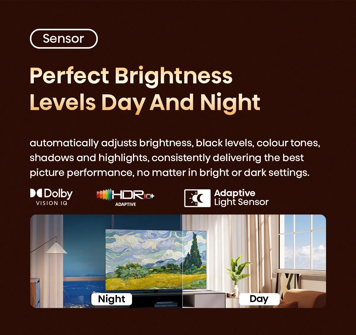 - Adaptive Light Sensor, Dolby Vision IQ, HDR 10+ Adaptive In addition to conventional HDR technologies, this TV is also equipped with a light sensor which enables automatic picture adjustment based on ambient lights.