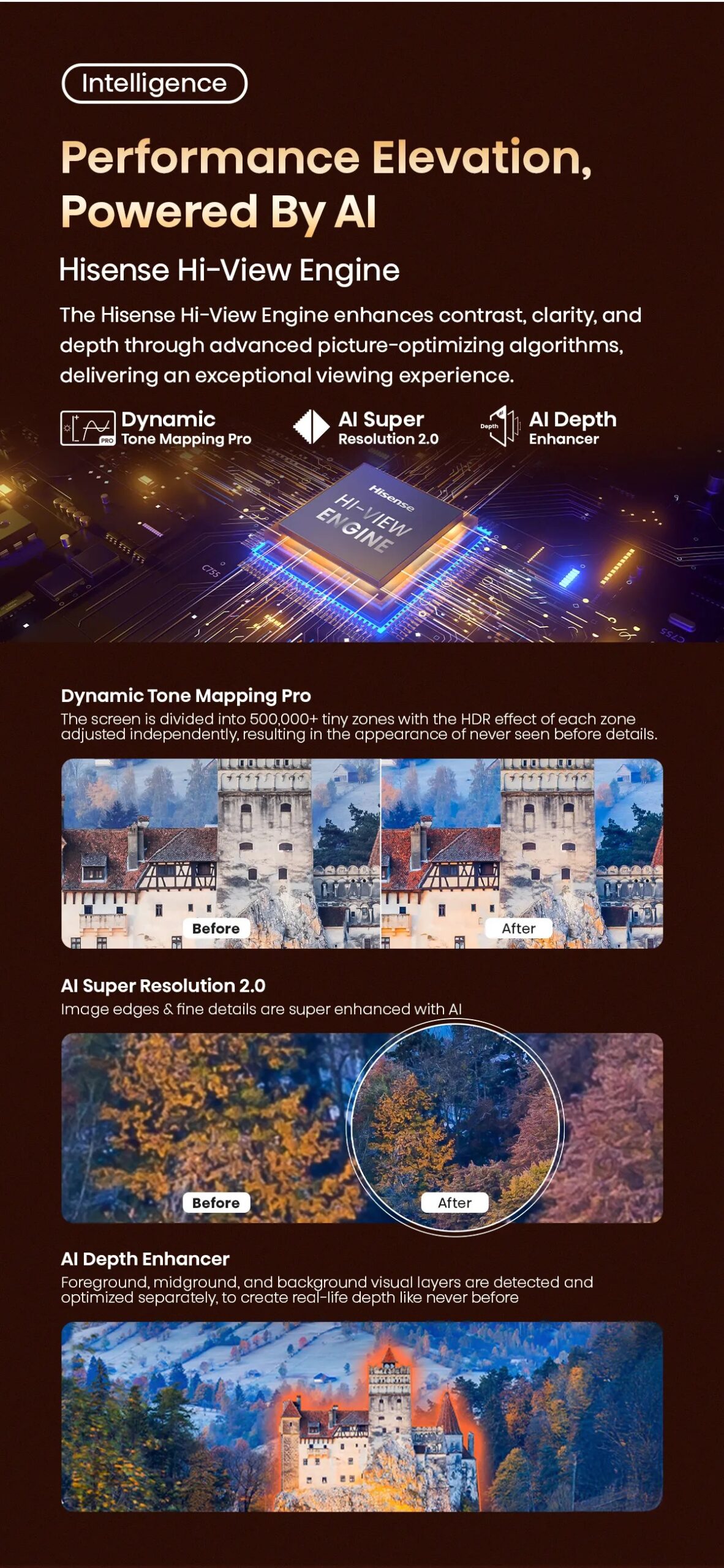 - Clarity & Contrast Hi-View Engine – 4K Al Upscaler, AI Picture