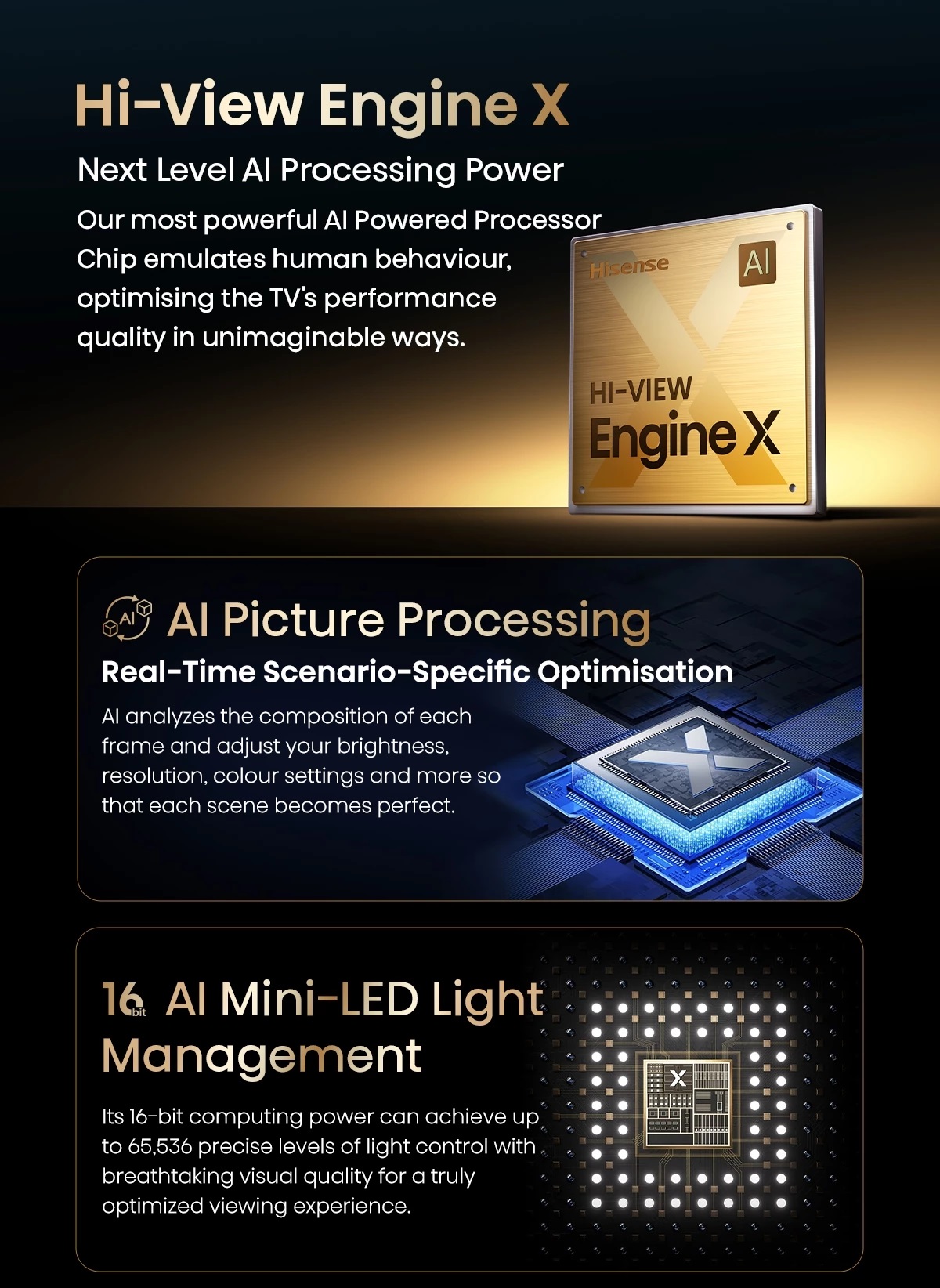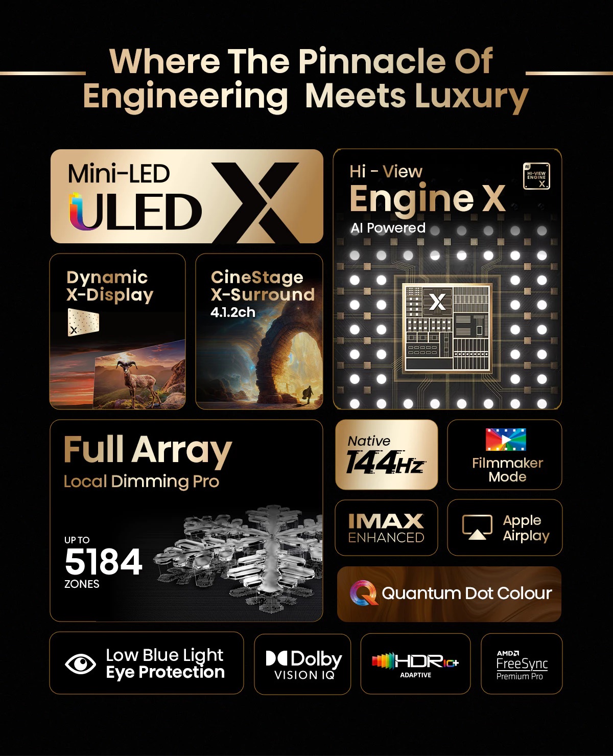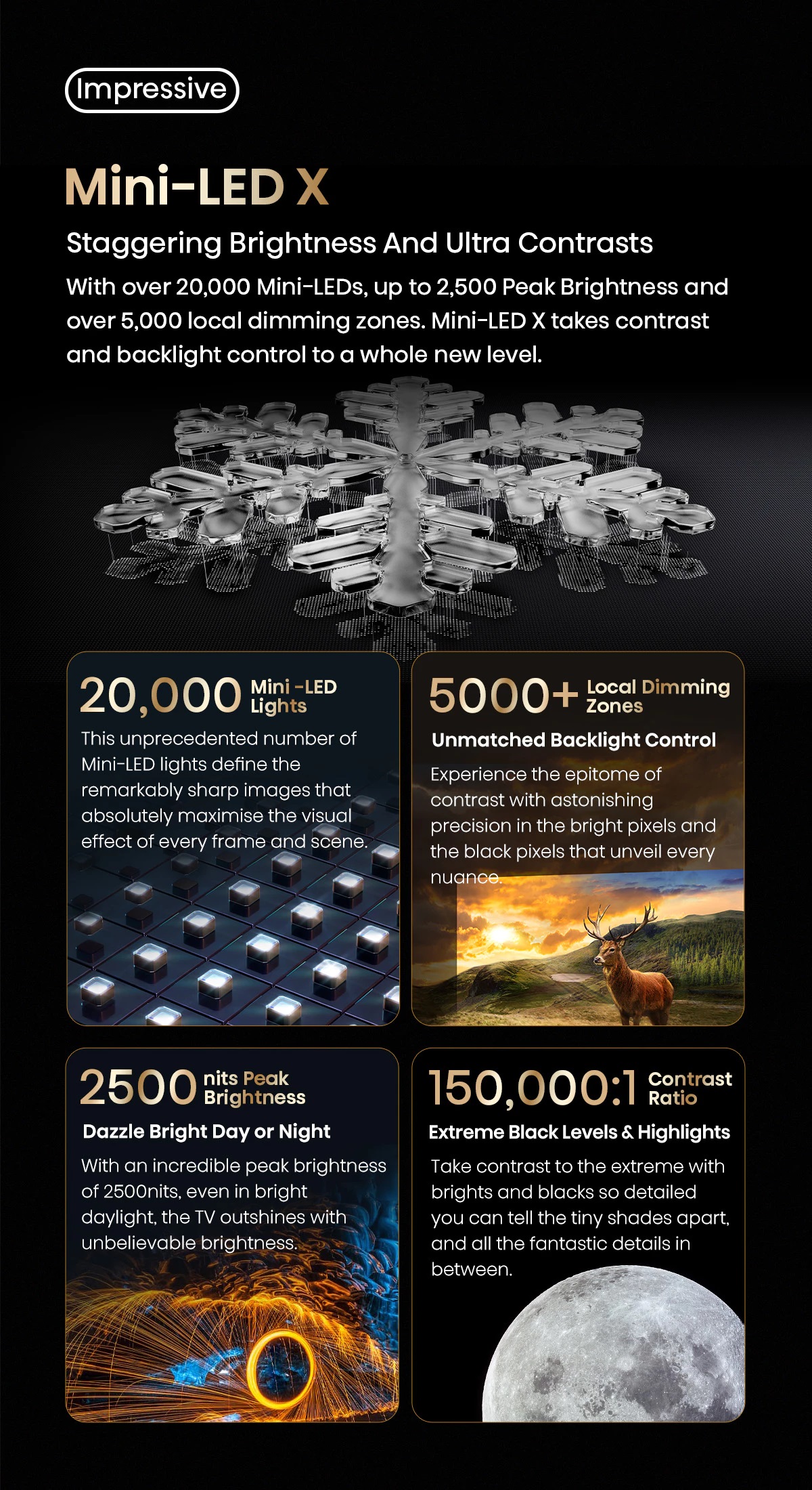• Premium 4K Mini LED X: 20,000 mini LED, 5,000 full array local dimming zones, 2,000 nits peak brightness and quantum dot colour ensure image quality like no second in its class