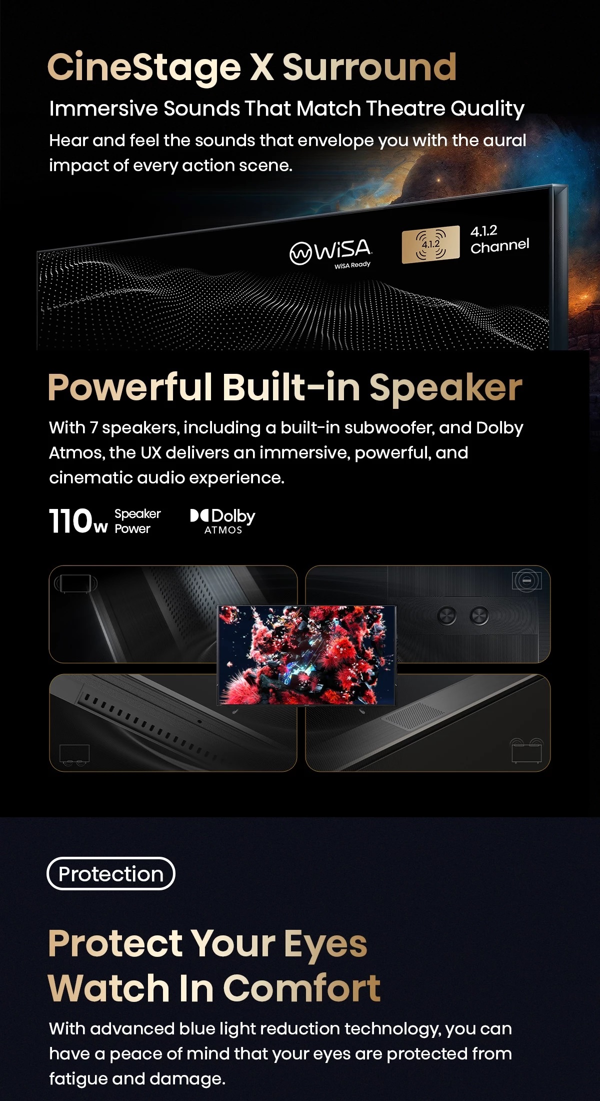 • CineStage X surround sound: with 4.1.2 surround sound with specially developed side speakers and integrated subwoofer ensures up to 80W sound volume