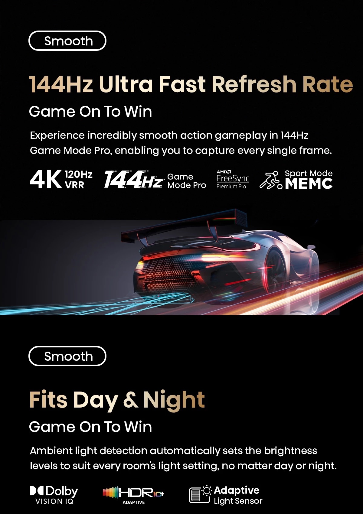• Game Mode Pro 144 Hz & Freesync Premium: pure gaming pleasure with HDMI 2.1 support (144 Hz@4K). Using ALLM, the TV automatically switches to game mode with the lowest latency in conjunction with the game console