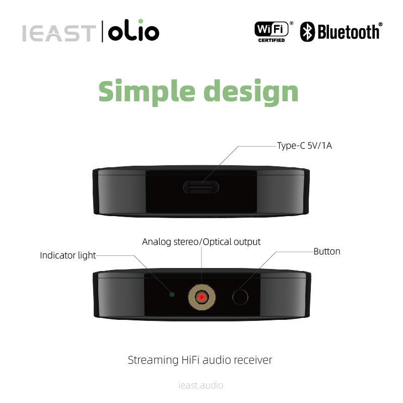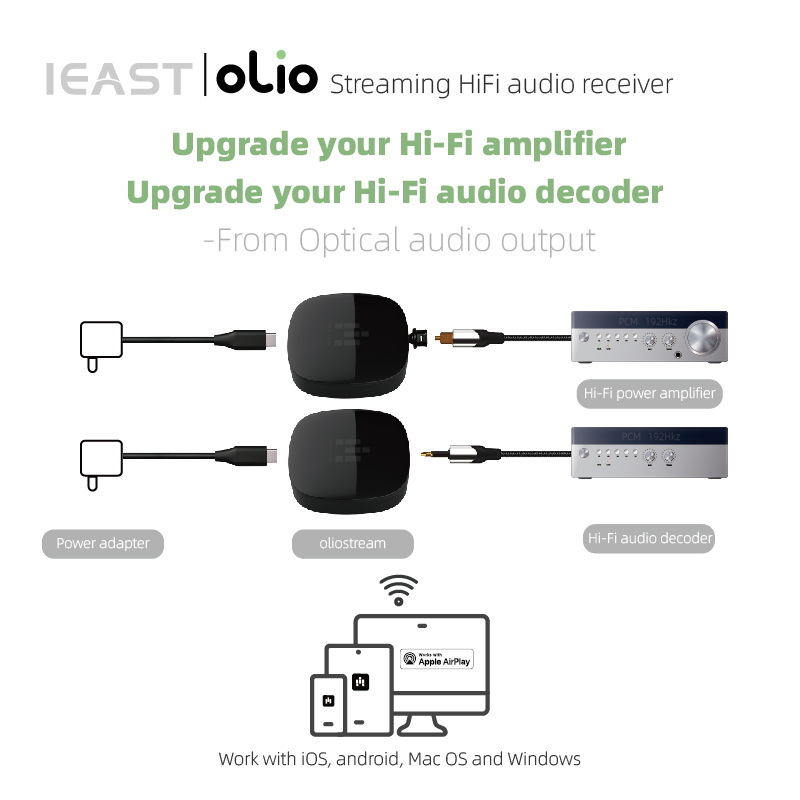 iEAST Olio is an innovative steaming audio receiver which can turn your current speakers, soundbar, home theater into a Wireless Multi-Room Sound System by connecting to your home Wi-Fi network.