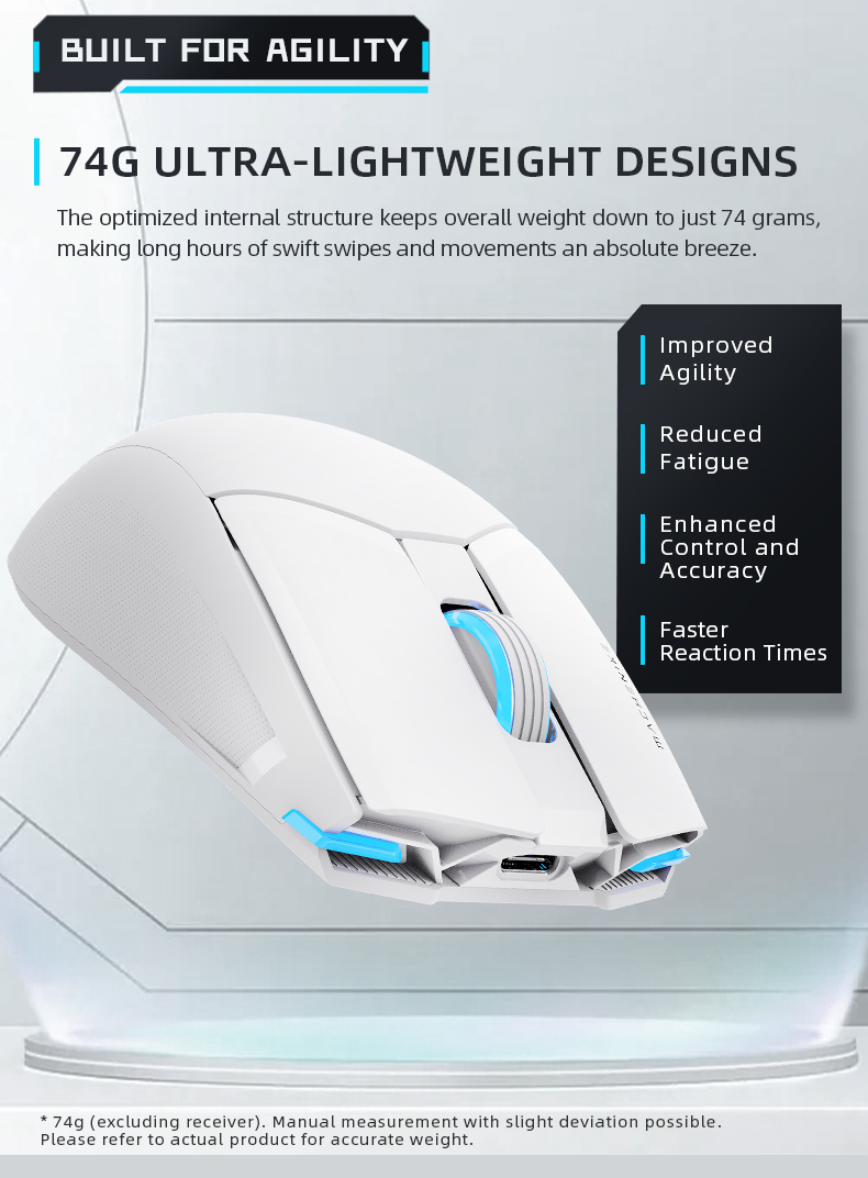 - Super Light Dual-Mode Mouse The optimized internal structure of MACHENIKE Gaming Mouse keeps overall weight down to just 74g, making long hours of swift swipes and movements an absolute breeze. Switch between wired and wireless at will