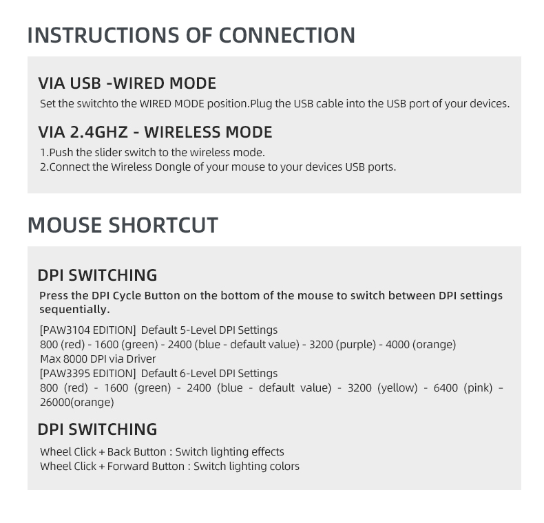 - Llighting: RGB,3 zones (wheel, DPI indicator,tail)
