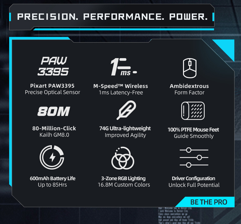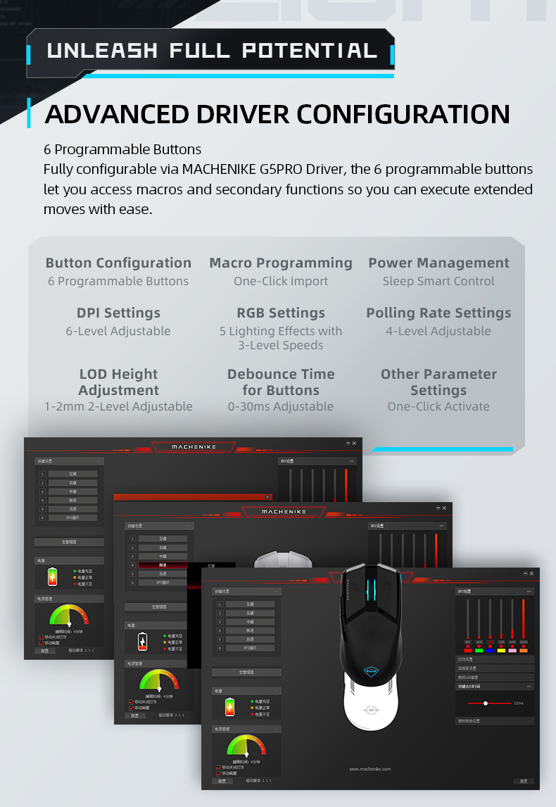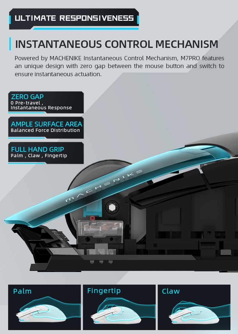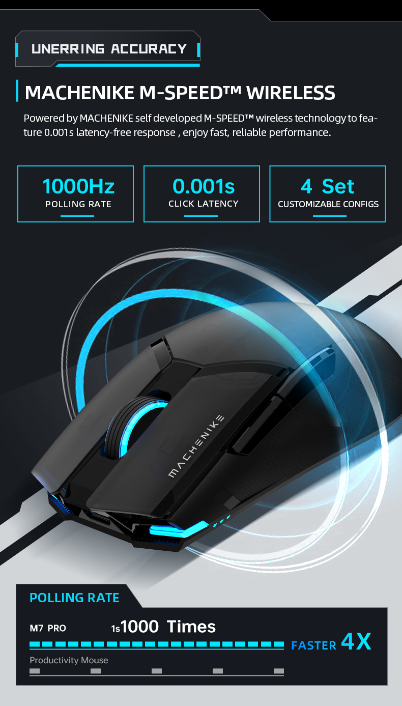- M-SPEED Wireless Technology This high performance Gaming Mouse is powered by MACHENIKE self developed M-SPEED wireless technology to feature 0.001s latency-free response , enjoy fast, reliable gaming experience