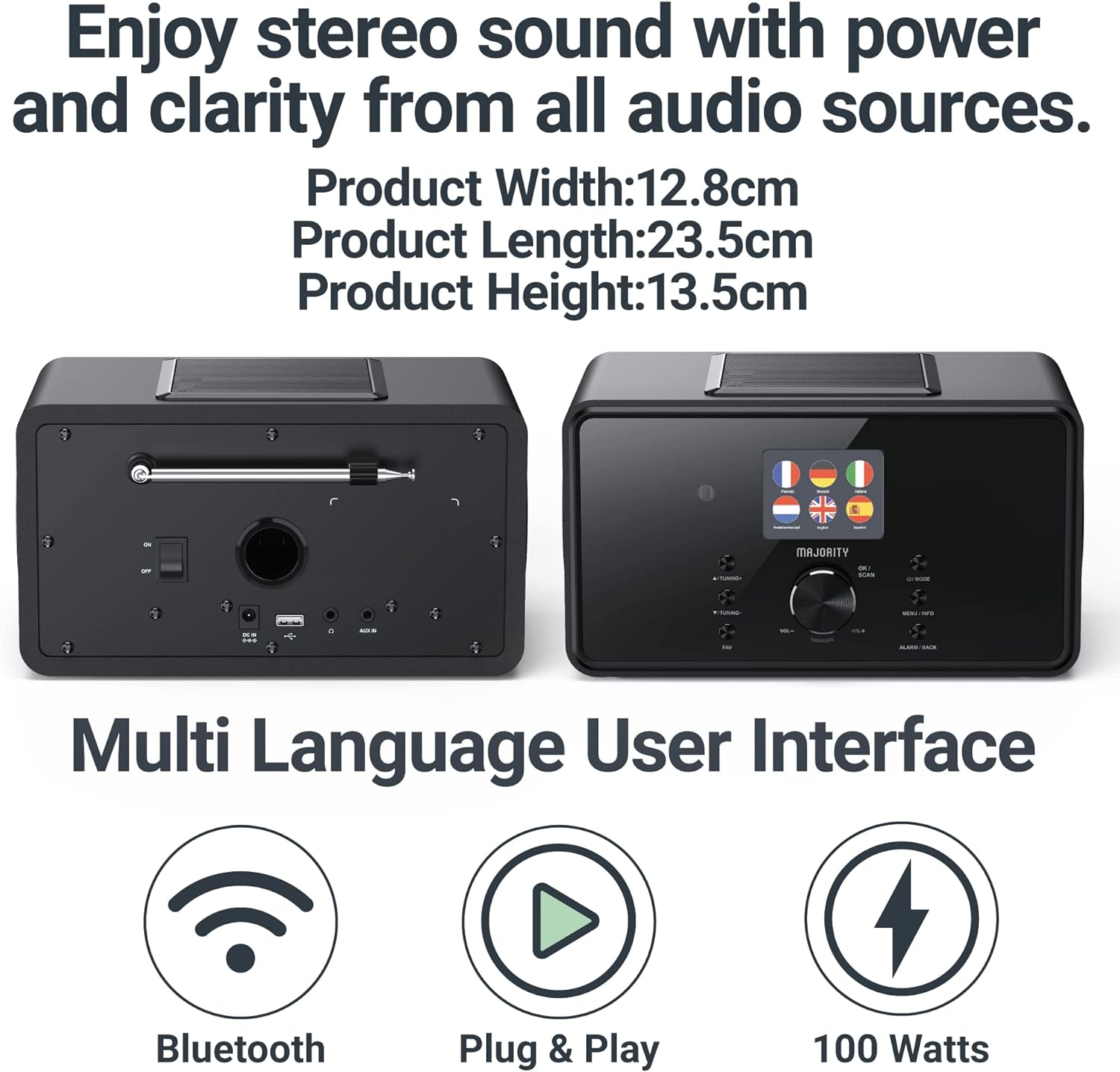 - 𝟰" 𝗦𝗣𝗘𝗔𝗞𝗘𝗥, 𝟭𝟬𝟬𝗪, 𝟮.𝟭 𝗖𝗛𝗔𝗡𝗡𝗘𝗟: Features dual 4-inch speakers and a robust 5-inch bass for a punchy 100-watt, 2.1 stereo sound experience. Enjoy deep bass, clear treble and lossless sound with our DAB Internet radio.