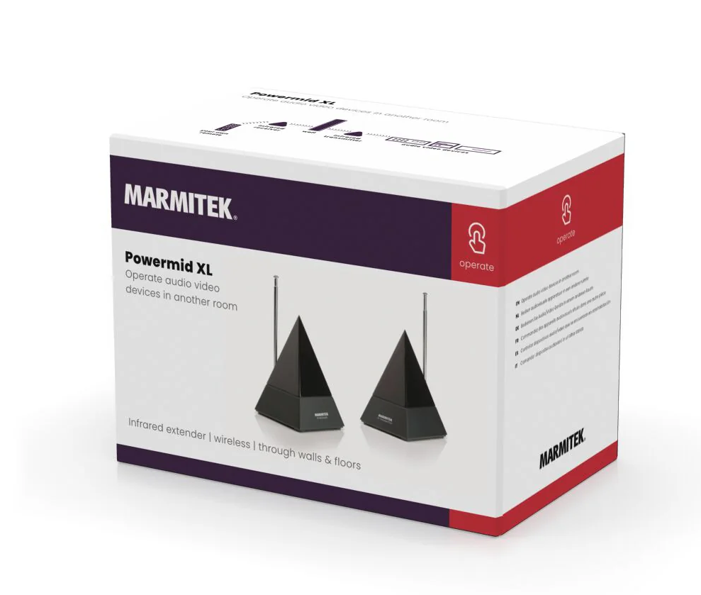 This wireless IR extender is suitable to use to operate equipment in another room or when you use a wall mount for your TV. Hang a TV freely and place the equipment you want to operate elsewhere. The Powermid XL consists of an IR receiver and IR transmitter. The signal passes through walls and floors. It's plug & play and works with all digital TV set-top boxes.