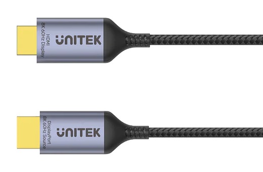 UNITEK DP 1.4 to HDMI 2.1 cable connects a computer, laptop, or other source device with DisplayPort to an HDTV/ monitor/ projector with HDMI output. Supports up to 8K@60Hz, HDCP 2.2 & Dolby Atmos.
