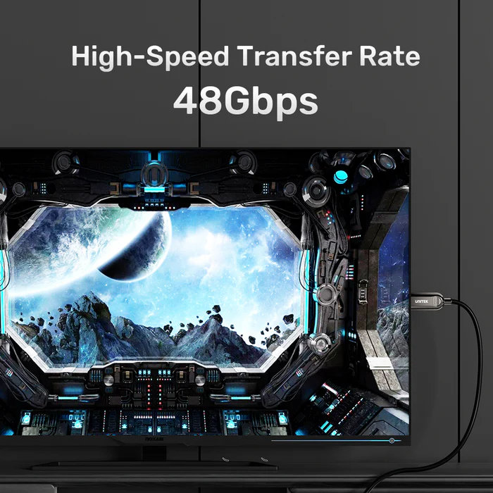 UNITEK Fiber Optic 8K HDMI cable features HDMI v2.1 specification with 48Gbps masscapacity bandwidth, this cable does not need HDMI repeater or active signal booster, with no loss of signal over distance and no signal degradation caused by EMI interference.