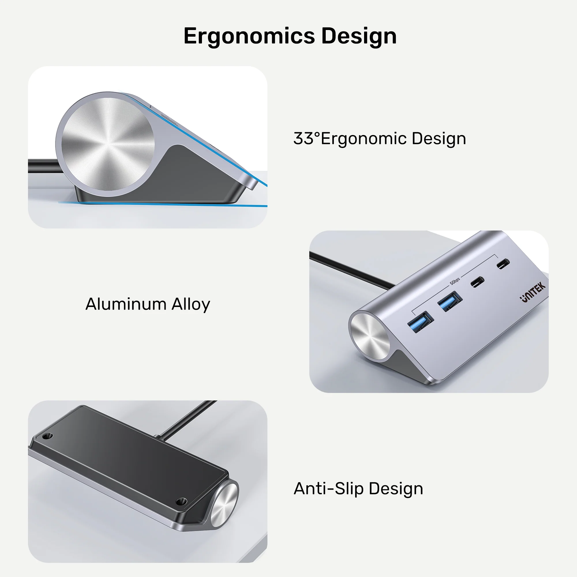 UNITEK HUB Q44-in-1 USB-C Hub extends 4 USB ports at 5 Gbps for your Mac or Windows PC/laptop. It includes 2 USB-A and 2 USB-C ports, supporting USB flash drives, mice, keyboards, and other USB peripherals. The improved ergonomics and accessibility are enhanced by a 33-degree angle design. With a USB-CDC 5V input, it provides stable power and data transfer for your work.