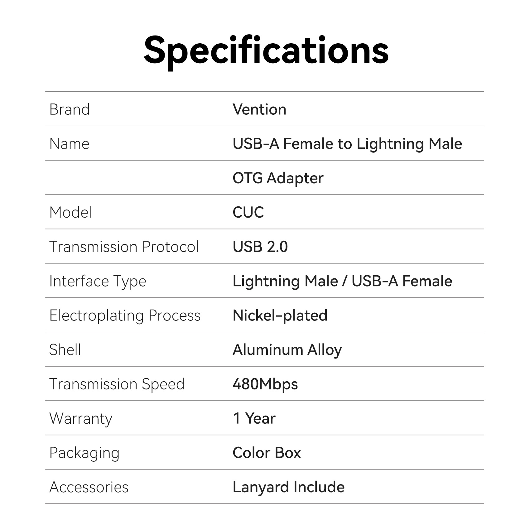 Vention Adaptor USB-A Female to Lightning Male OTG CUCH0