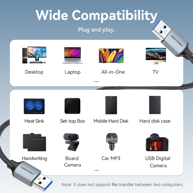This cable is a high-speed USB-A 3.0 Male-to-Male designed for both durability and performance. It is commonly used to connect peripherals like external hard drive enclosures, laptop cooling pads, or cameras to a computer.