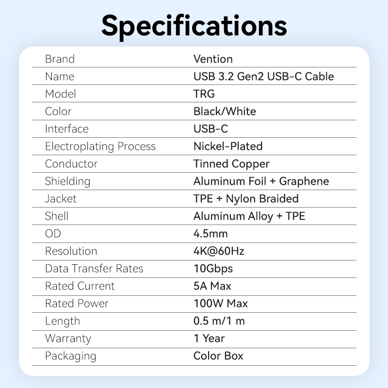 Vention IT Cable USB-C 3.2 Gen2 M-M 1.0m Braided Aluminum White TRGWF