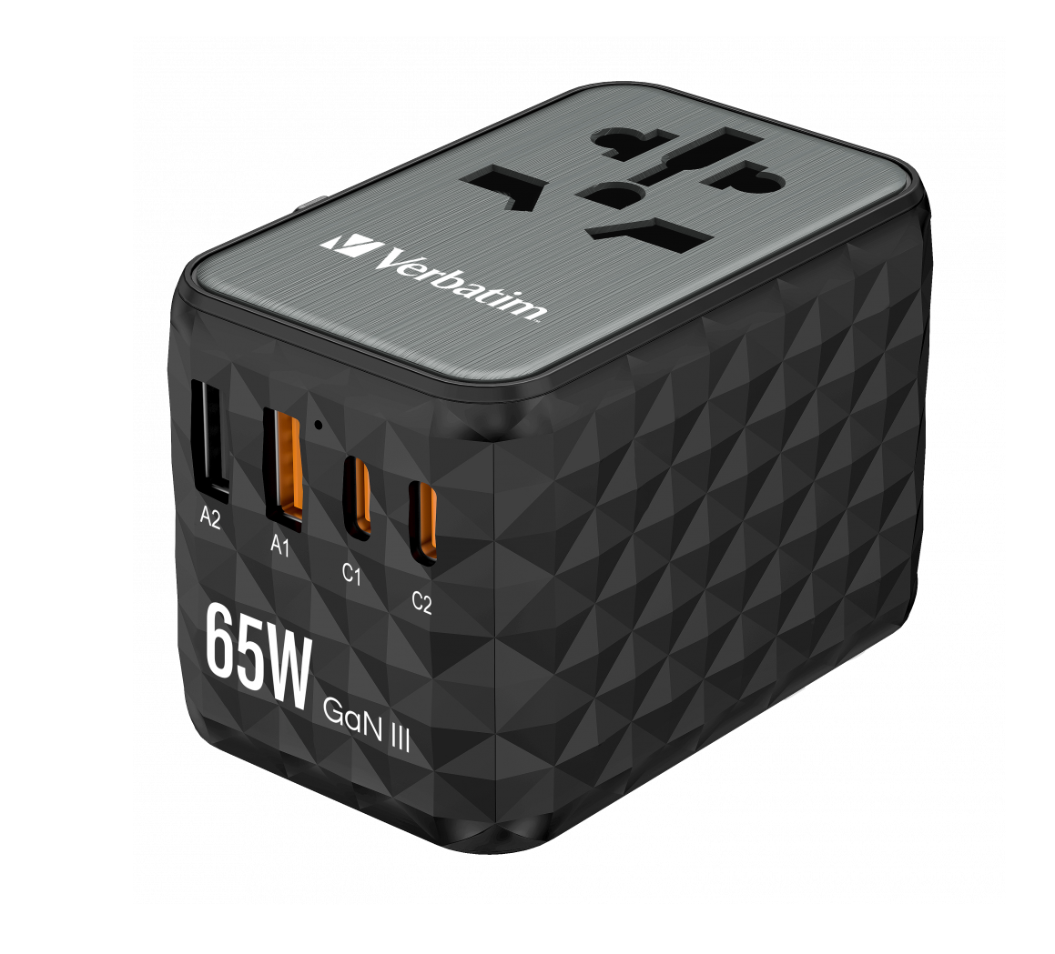 The compact and powerful Verbatim GaN III Universal Travel Adapter allows five devices to be charged simultaneously through the AC power socket and the two USB-C and two USB-A ports.